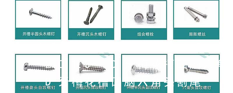 主要分类包括普通螺丝、机螺丝、自攻螺丝和膨胀螺丝三种。有头螺钉Cap screw 过去限于全牙的扣件。六角头螺钉Hex cap screw与大六角螺栓Hex bolt 顾名思义为头部为六角型的外螺纹扣件,设计为使用扳手转动。依照ASME B18.2. 不锈钢三角牙螺丝 Stainless Steel Tri-Lobular Thread Screws 型号说明 P是指头型是PAN头;A是指尖尾牙,B是指平尾牙,即PA圆头尖嘴钢牙,PB圆头平嘴钢牙。自攻类:◆圆头自攻螺丝PA ◆圆头平尾自攻螺丝PB ◆圆头割尾自攻